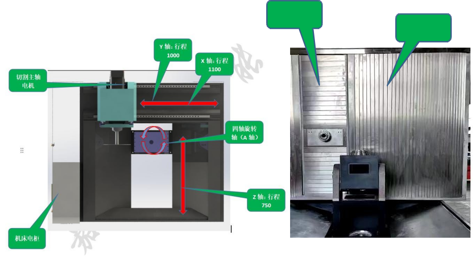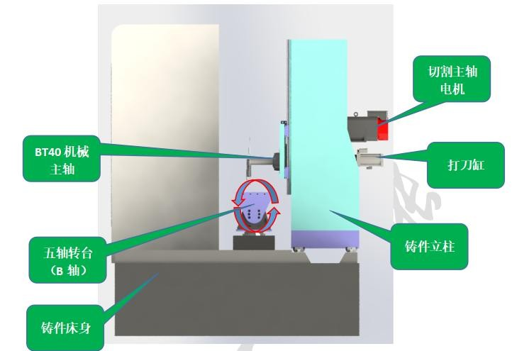 切割主軸;采用電機(jī)帶動(dòng)BT40機(jī)械主軸連續(xù)旋轉(zhuǎn),轉(zhuǎn)速3000rpm/min,配有自動(dòng)打刀缸,主軸上方裝有打刀按鈕,更換不同型號(hào)鋸片時(shí)直接手動(dòng)切換即可,無需在設(shè)備上更換,安全、省力。